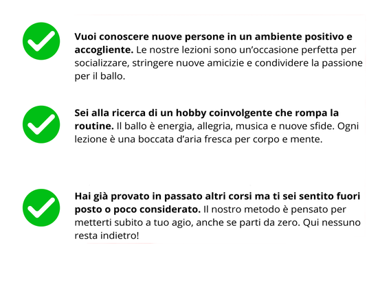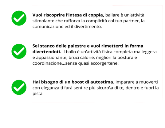 Un percorso dedicato alle coppie che vogliono imparare a ballare con eleganza senza rinunciare al divertimento! Dai Balli da sala/Liscio ai ritmi travolgenti dei Latino americani, il corso offre una preparazione a 360 gradi per sentirsi sicuri e pronti a scendere in pista in ogni occasione. Questo corso, diviso in due livelli (principianti ed intermedio) costituisce il punto di partenza per poter accedere agli allenamenti guidati del gruppo di livello avanzato, dove vengono trattate le Danze Standard.