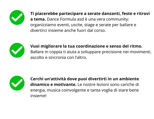 Foxtrot, Valzer Lento, Tango, Bachata, Salsa, Cha Cha Cha, Rumba, Jive, Mazurka, Valzer Viennese.