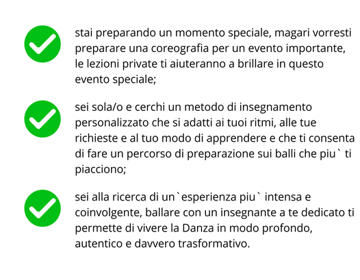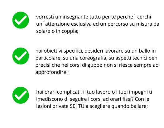 Le Lezioni private sono appuntamenti personalizzati con un maestro che in quell`ora si dedica esclusivamente a te (o alla tua coppia), per offrirti un`esperienza di apprendimento su misura. Sono auto prenotabili, flessibili negli orari e disponibili per tutti gli stili di ballo.