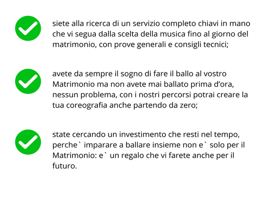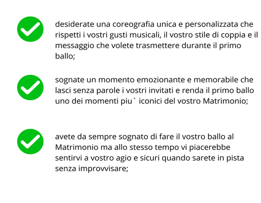 Grazie ai nostri pacchetti di ballo per il matrimonio vi accompagneremo passo dopo passo nella creazione di una performance che parli di voi, della vostra storia e del vostro stile. Non vi preoccupate se non avete mai ballato prima d`ora, insieme costruiremo qualcosa di veramente unico su misura per voi e sulla vostra canzone preferita.